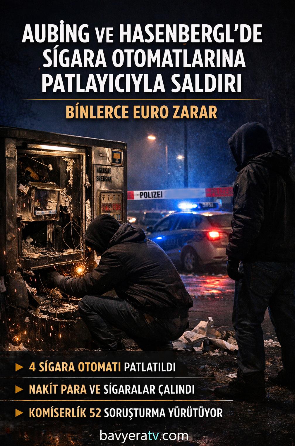 Münih’in Aubing ve Hasenbergl semtlerinde yılbaşı gecesi ve sonrasında sigara otomatlarına yönelik ciddi bir saldırı gerçekleştirildi. Polis açıklamasına göre, 31 Aralık 2025 Çarşamba günü saat 20.00 ile 2 Ocak 2026 Cuma günü saat 06.00 arasında toplam dört sigara otomatı patlatıldı.