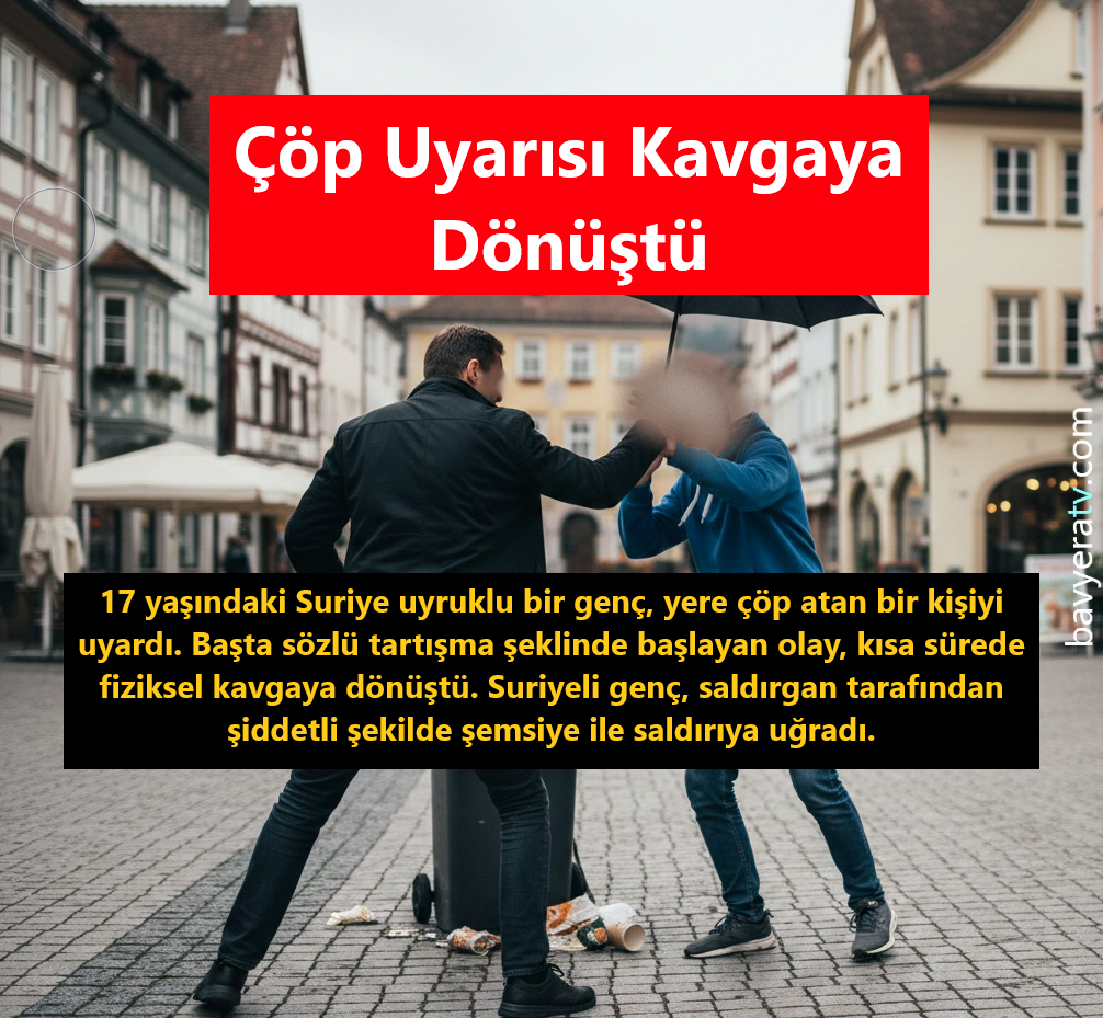 Bavyera’nın Immenstadt kasabasında, Cuma günü öğleden sonra, 17 yaşındaki Suriye uyruklu bir genç, yere çöp atan bir kişiyi uyardı. Başta sözlü tartışma şeklinde başlayan olay, kısa sürede fiziksel kavgaya dönüştü. Genç, saldırgan tarafından defalarca şemsiye ile vuruldu.