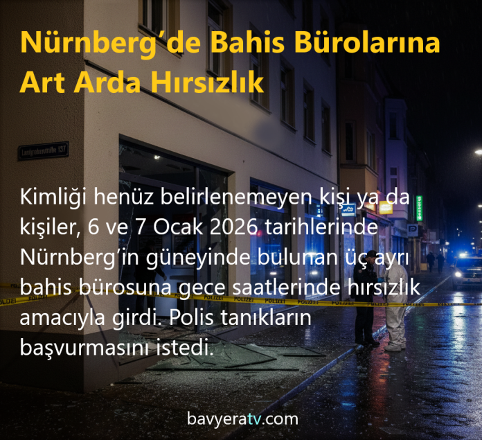 NÜRNBERG – Kimliği henüz belirlenemeyen kişi ya da kişiler, 6 ve 7 Ocak 2026 tarihlerinde Nürnberg’in güneyinde bulunan üç ayrı bahis bürosuna gece saatlerinde hırsızlık amacıyla girdi. Olaylarla ilgili soruşturma sürerken, polis tanıkların başvurmasını istedi.