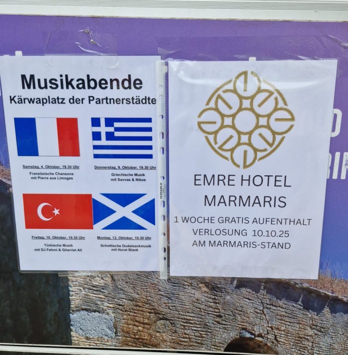 Fürth’te başlayan ve 15 Ekim’e kadar sürecek Hasat Bayramı (Fürther Michaeliskirchweih) kapsamında, Fürth ile Marmaris arasındaki 30 yıllık kardeş şehir ilişkileri kutlanacak. Bu kapsamda düzenlenecek “Türk Gecesi” etkinliği, 10 Ekim Cuma akşamı Kardeş Şehirler Meydanı’nda gerçekleştirilecek. Gecede canlı müzik performansları da yer alacak.