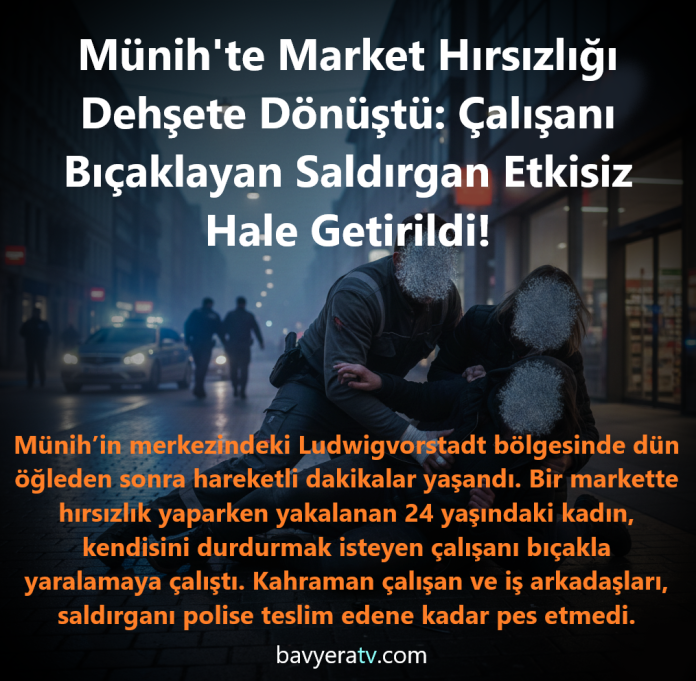 Münih’in merkezindeki Ludwigvorstadt bölgesinde dün öğleden sonra hareketli dakikalar yaşandı. Bir markette hırsızlık yaparken yakalanan 24 yaşındaki kadın, kendisini durdurmak isteyen çalışanı bıçakla ağır yaralamaya çalıştı. Kahraman çalışan ve iş arkadaşları, saldırganı polise teslim edene kadar pes etmedi.