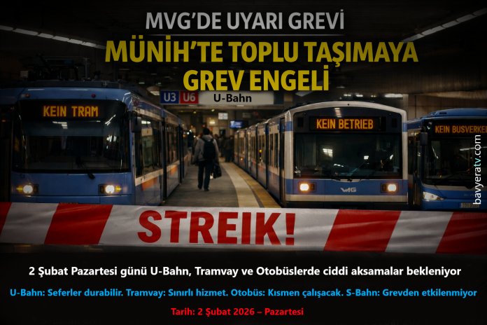 MÜNİH – Almanya’da kamu sektöründe devam eden toplu iş sözleşmesi görüşmeleri kapsamında, ver.di sendikası Münih’te toplu taşıma çalışanlarını 2 Şubat 2026 Pazartesi günü için tam gün uyarı grevine çağırdı. Grevden, Münih Ulaşım Kurumu MVG bünyesindeki U-Bahn (metro), tramvay ve 199 numaraya kadar olan otobüs hatları etkilenecek.