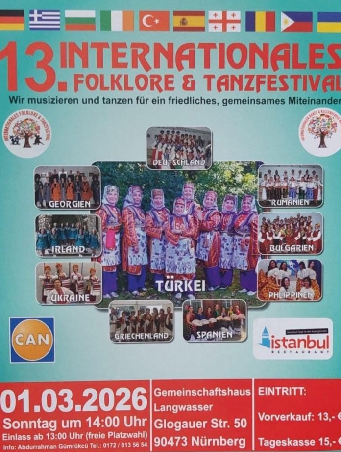 Nürnberg’de her yıl geleneksel olarak düzenlenen Uluslararası Folklor Şenliği, bu yıl 13’üncü kez kültür ve sanatseverlerle buluşmaya hazırlanıyor. Başkanlığını Abdurrahman Gümrükçü’nün yaptığı Uluslararası Sanat ve Kültür Derneği tarafından organize edilen şenlik, 1 Mart 2026 Pazar günü saat 14.00’ten itibaren Glogauerstr. 50 adresinde bulunan Gemeinschafthaus Nürnberg Langwasser’de gerçekleştirilecek.
