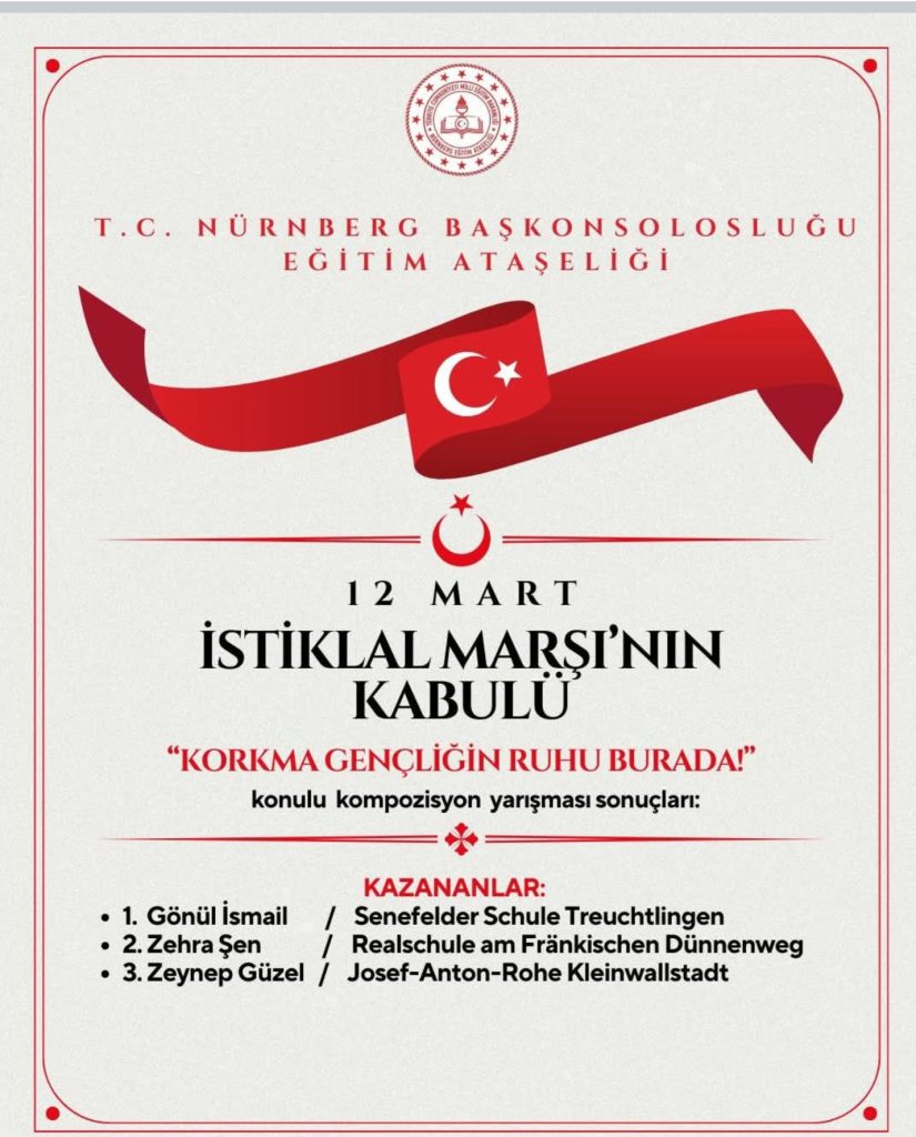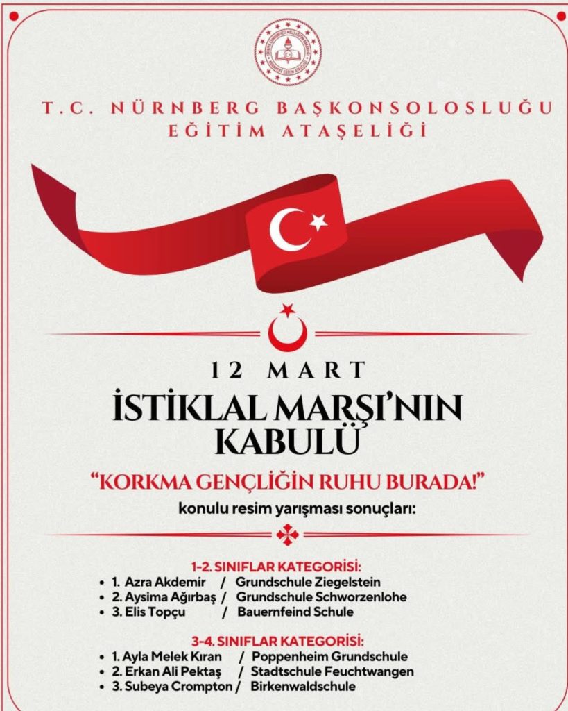 Nürnberg Eğitim Ataşeliği tarafından, İstiklal şairi Mehmet Akif Ersoy’u anmak ve İstiklal Marşı’nın kabulünün 105. yılı dolayısıyla düzenlenen “Korkma, Gençliğin Ruhu Burada” konulu resim ve kompozisyon yarışmasının sonuçları açıklandı.