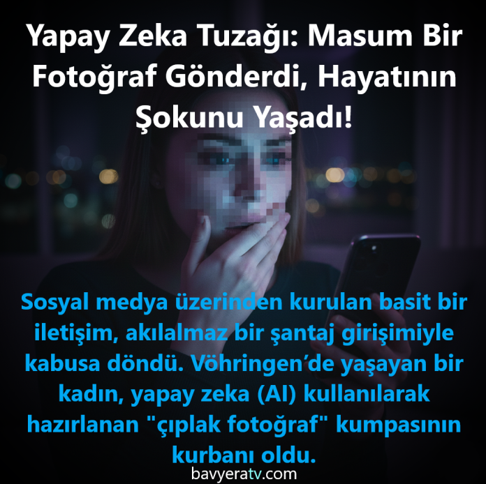 VÖHRINGEN – Sosyal medya üzerinden kurulan basit bir iletişim, akılalmaz bir şantaj girişimiyle kabusa döndü. Vöhringen’de yaşayan bir kadın, yapay zeka (AI) kullanılarak hazırlanan “çıplak fotoğraf” kumpasının kurbanı oldu.